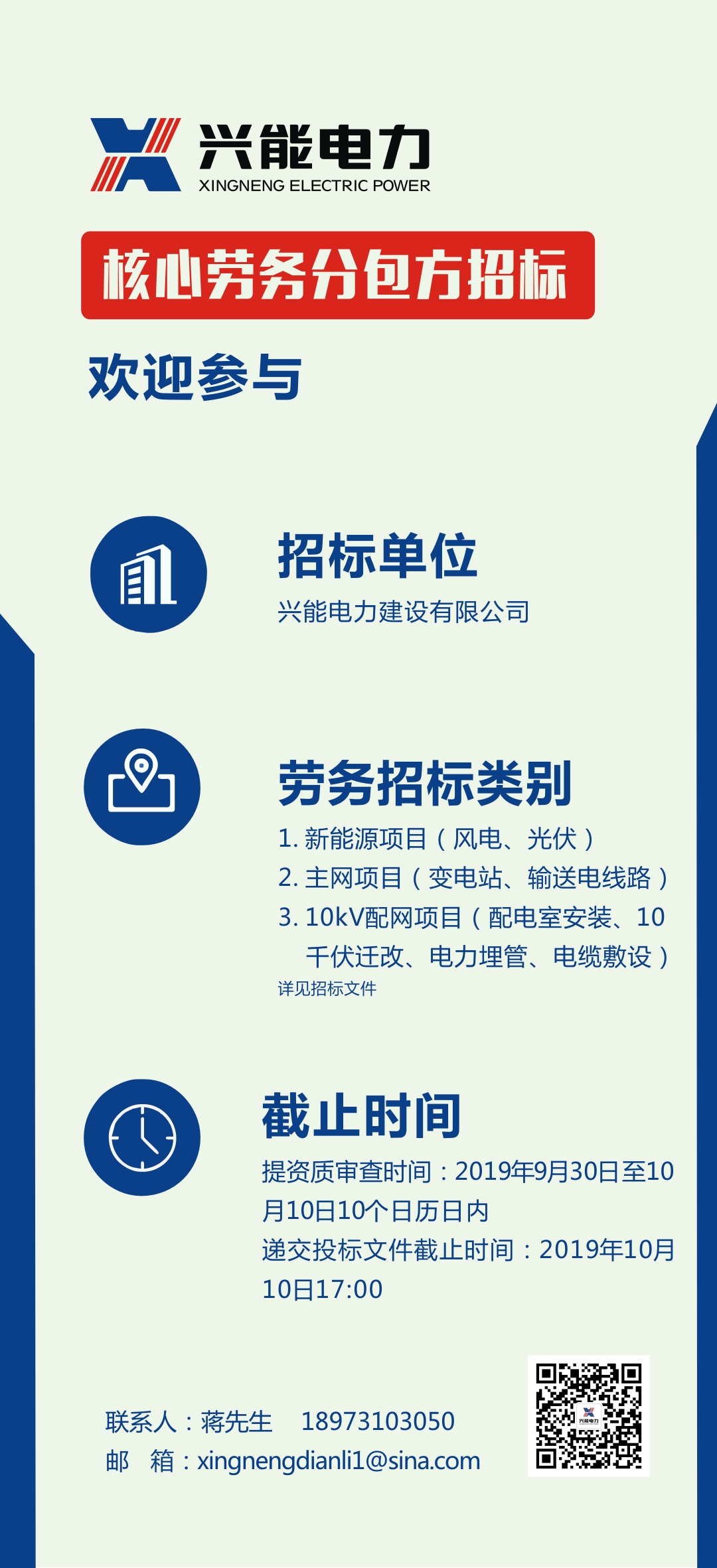 根據公司近期業(yè)務(wù)發(fā)展情況,特對光伏發(fā)電、風(fēng)力發(fā)電、傳統輸送變電工程、傳統配網(wǎng)工程等勞務(wù)分包施工單位進(jìn)行入圍招標,本著(zhù)友好合作,互利共贏(yíng)的原則誠摯邀請各位勞務(wù)施工單位參與本次招標資格預審工作!本次具體招標工作如下: