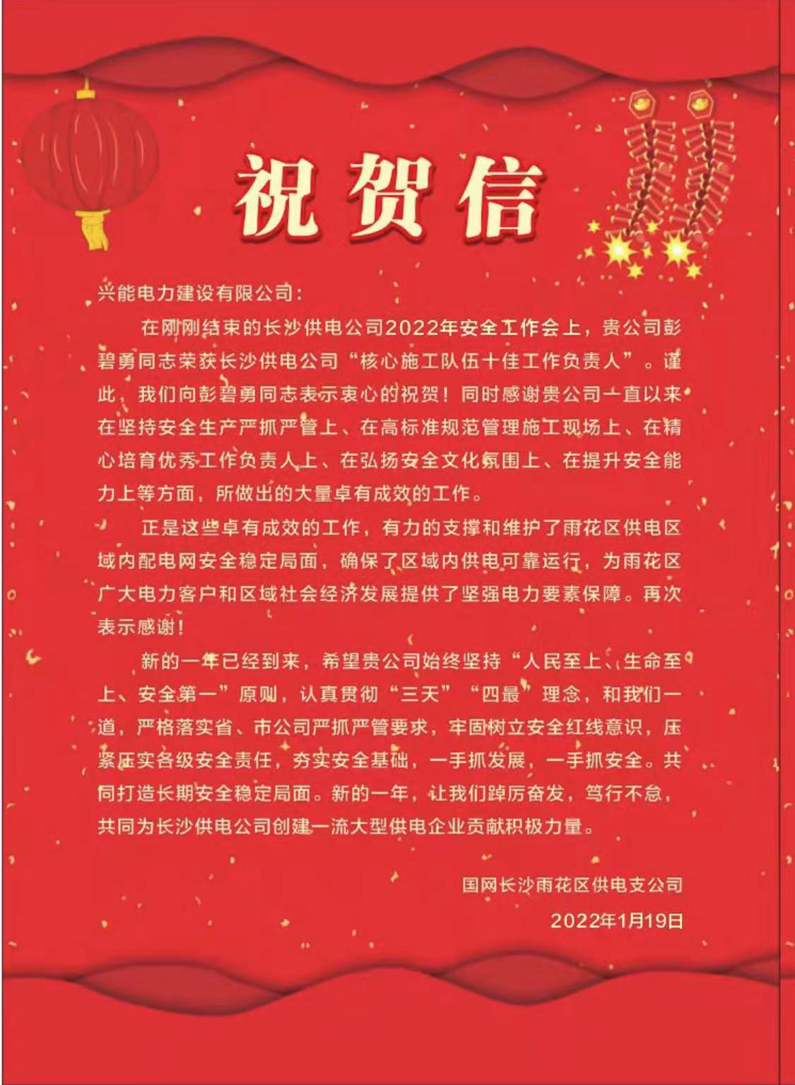 1月21日,國家電網(wǎng)長(cháng)沙雨花區供電支公司總經(jīng)理繆勇、安監部主任危煒一行專(zhuān)程送來(lái)祝賀信,祝賀公司彭碧勇榮獲長(cháng)沙供電公司“核心隊伍十佳工作負責人”,同時(shí)對公司一年來(lái)嚴抓安全管理,主動(dòng)作為、優(yōu)質(zhì)高效完成運維保電工作,為轄區電網(wǎng)持續安全穩定可靠運行做出的突出貢獻表示衷心感謝。